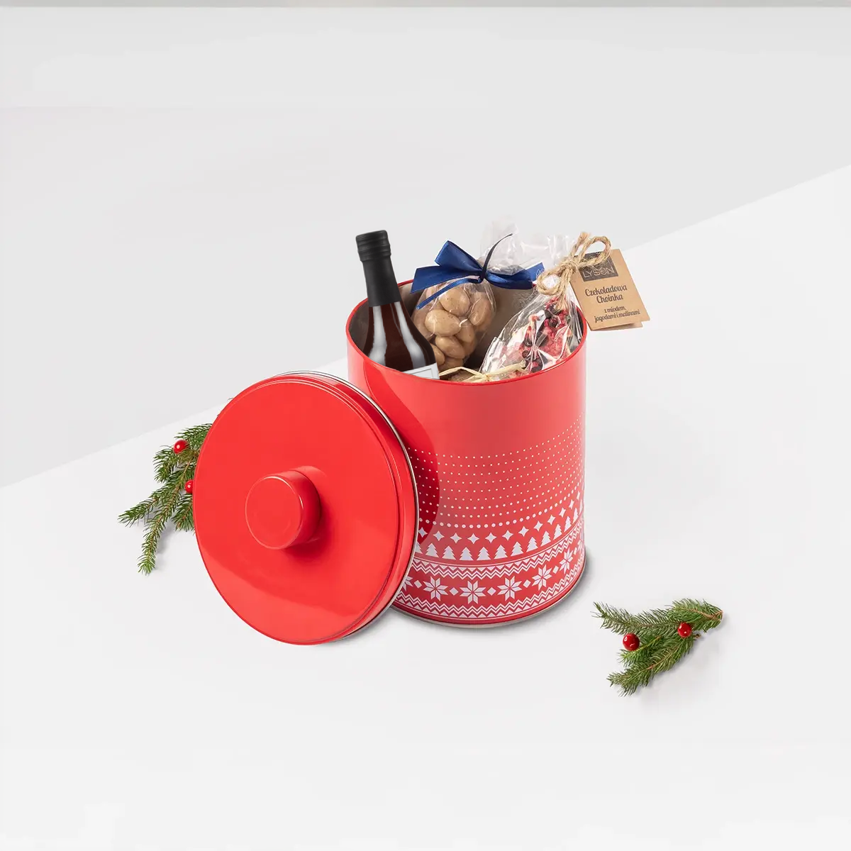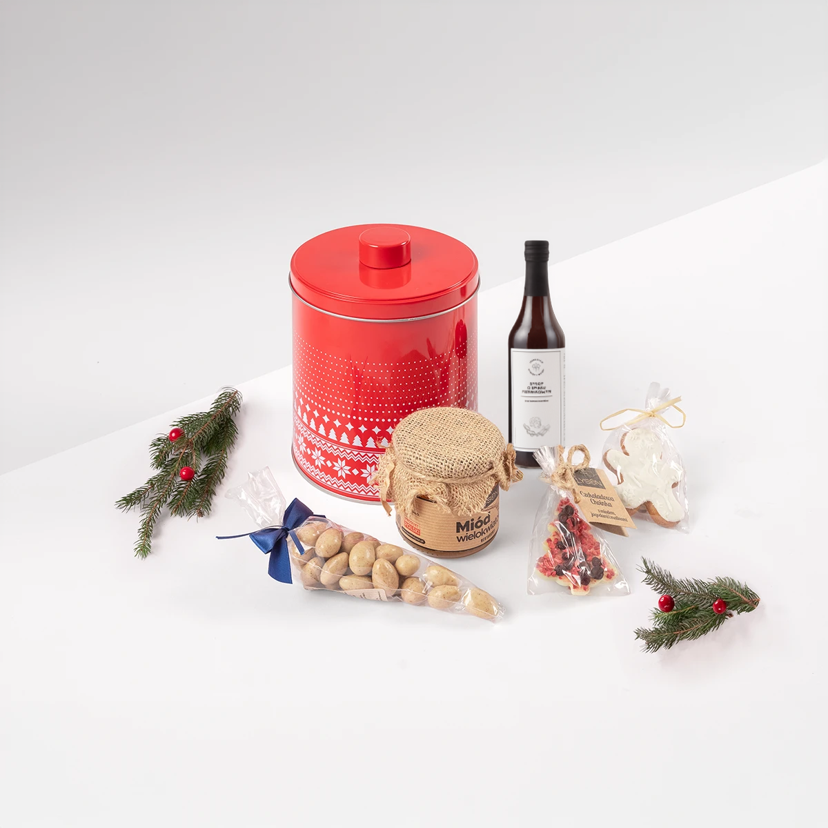 Świąteczna Puszka to gotowy i praktyczny zestaw prezentowy dla firm, które potrzebują szybkiego, eleganckiego i pewnego upominku. Ten kompaktowy box prezentowy doskonale sprawdzi się jako kosz prezentowy dla pracowników, paczka świąteczna dla klientów lub uniwersalny kosz upominkowy dla partnerów biznesowych. Stylowa puszka ze słodkościami tworzy efektowny, gotowy kosz prezentowy, idealny do wręczenia od razu — bez przygotowań i bez tracenia czasu.