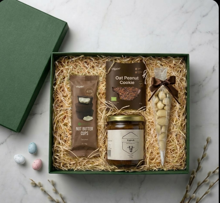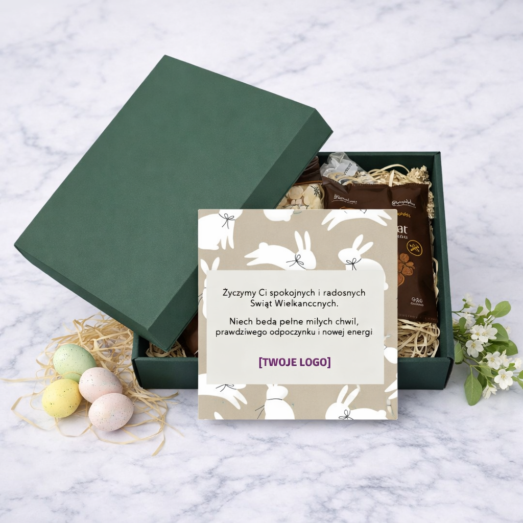Stylowy zestaw wielkanocny Słodki Orzeszek to propozycja dla osób, które cenią proste, wyraziste smaki i elegancką formę prezentu. Kompozycja została przygotowana w minimalistycznym, męskim stylu – w zielonym pudełku prezentowym z naturalnym wypełnieniem, które podkreśla charakter zestawu. Taki zestaw prezentowy dla firm doskonale sprawdzi się jako firmowy upominek lub stylowy kosz prezentowy na wiosnę i inne okazje biznesowe.