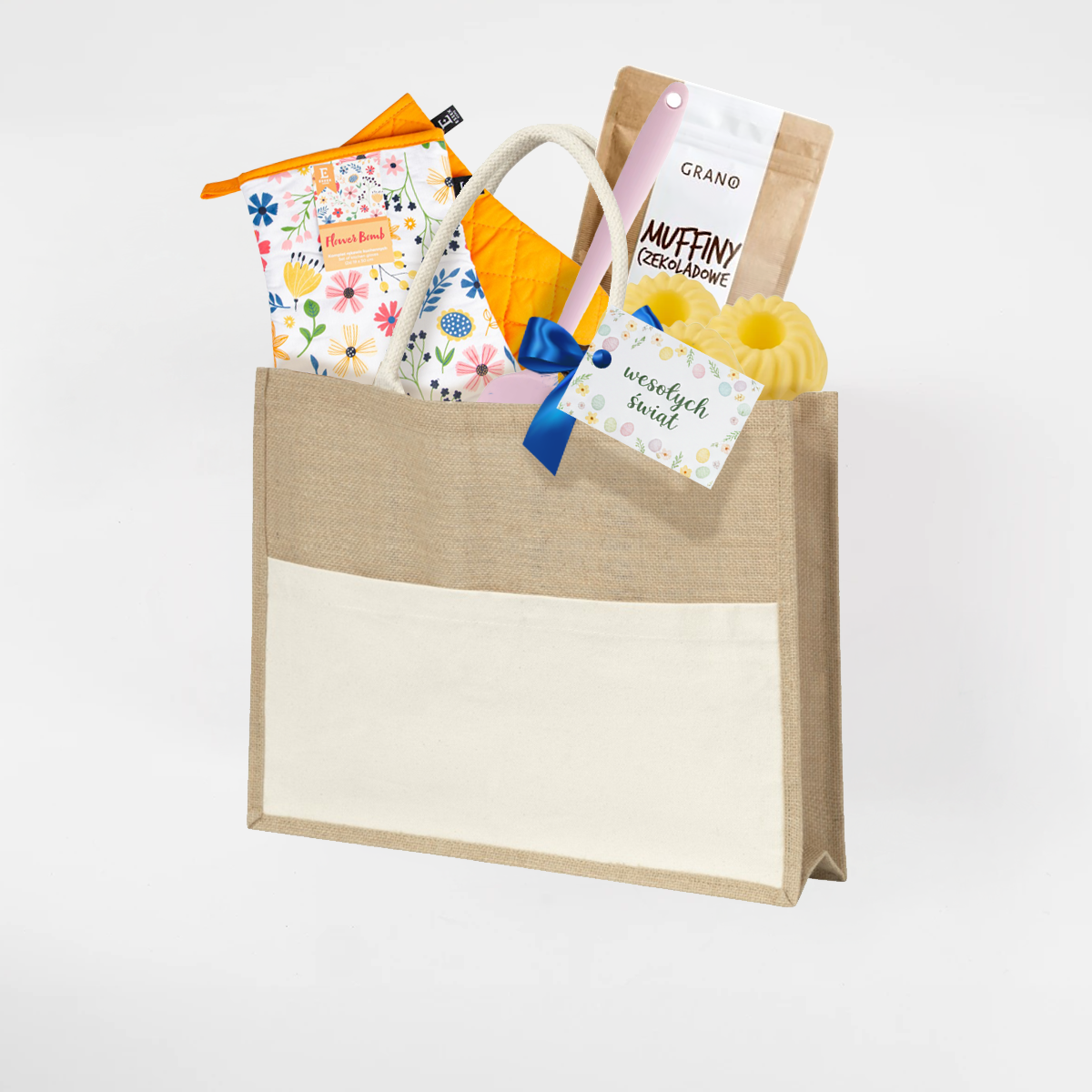 Zestaw zapakowany jest w estetyczną, naturalną torbę z juty, dzięki czemu prezentuje się elegancko i jest od razu gotowy do wręczenia jako firmowy upominek wielkanocny.
