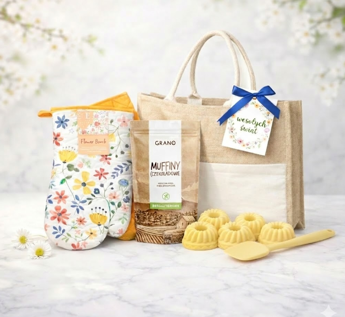 Kreatywny zestaw wielkanocny dla firm, który łączy słodki upominek z przyjemnością wspólnego pieczenia. To oryginalny pomysł na prezent dla pracowników, klientów lub partnerów biznesowych, który wprowadza w świąteczny, wiosenny nastrój i zachęca do spędzenia miłych chwil przy przygotowywaniu domowych wypieków.